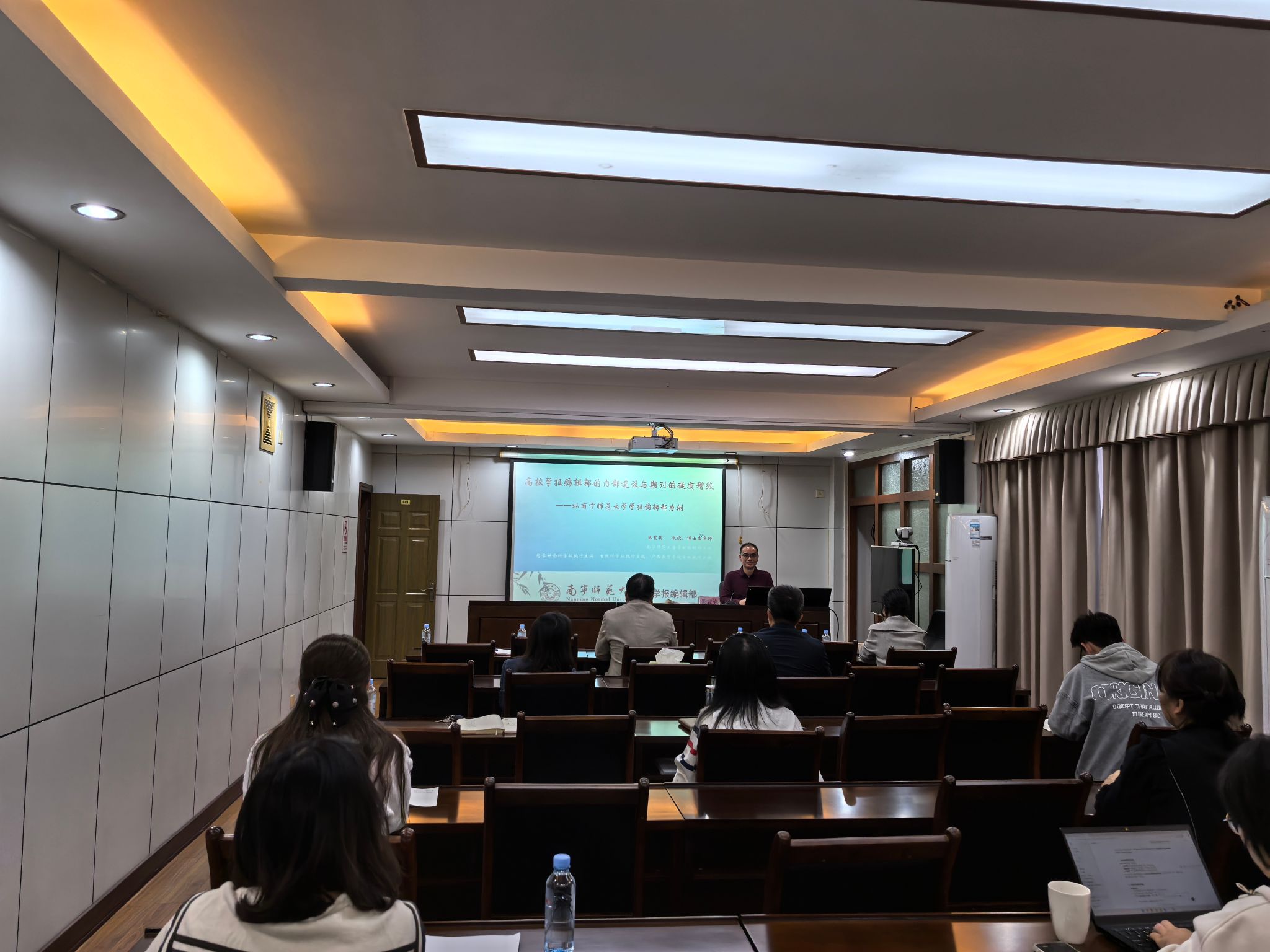 10月22日(周三)下午16:00-18:30,学报编辑部主任张震英教授在广西民族研究中心做了题为“高校学报编辑部的内部建设与期刊的提质增效——以南宁师范大学学报编辑部为例”的学术报告,该讲座系《广西民族研究》创刊40周年纪念活动之“名编名家系列讲座”第四讲,讲座由广西民族研究中心副主任、《广西民族研究》副主编黄仲盈主持,来自《广西民族研究》编辑部的全体人员听取了讲座。