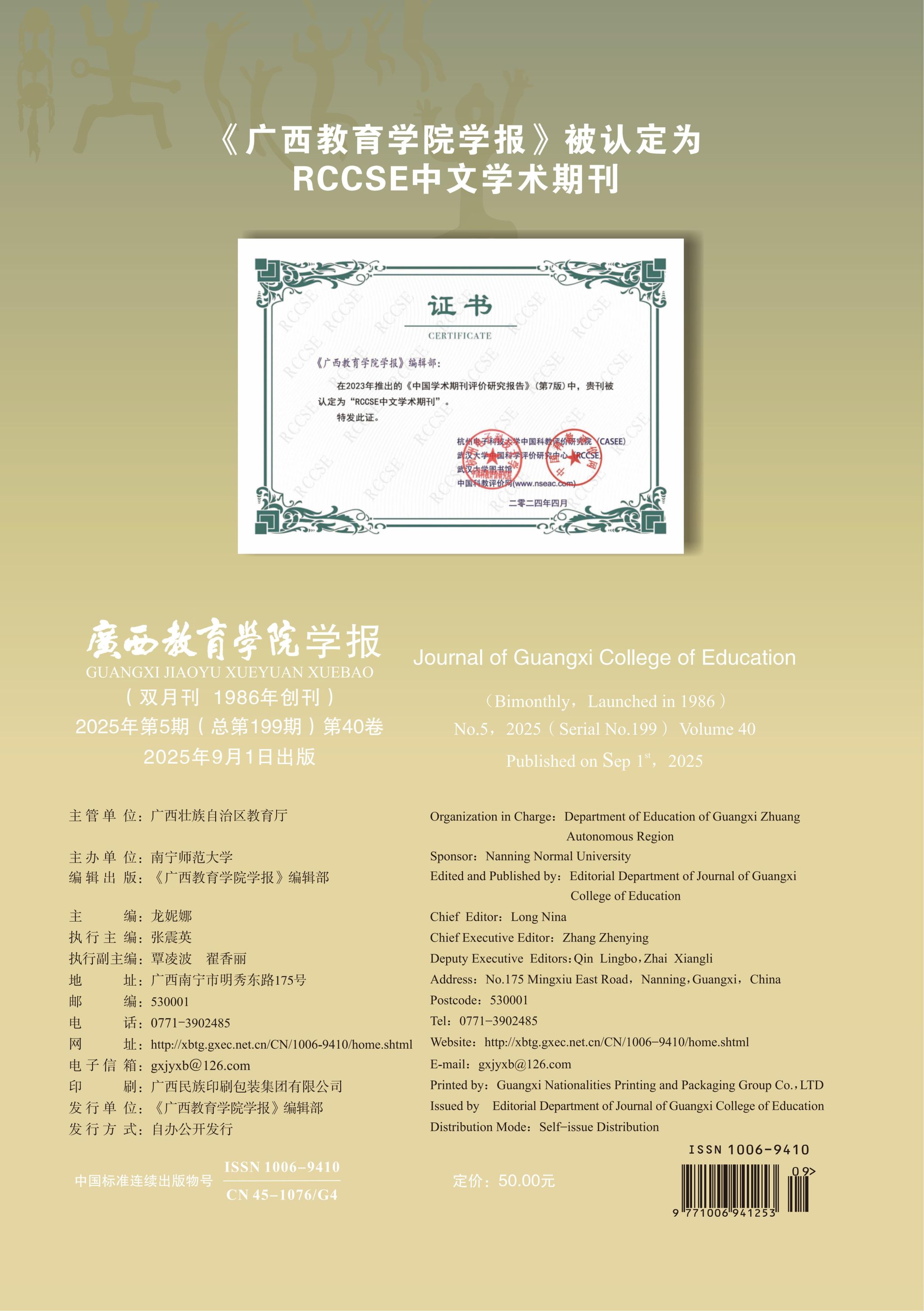 《广西教育学院学报》创刊于1986年,由广西教育厅主管、南宁师范大学主办,双月刊,每逢单月1号出刊,为全国公开发行的教育类专业学术刊物,是南宁师范大学学报编辑部负责编辑出版的三种学术刊物之一。学报为中国知网全文数据库收录期刊,中国学术期刊综合评价数据库统计源期刊,中国人民大学复印报刊资料数据库收录期刊。学报在《中国人文社会科学期刊 AMI 综合评价报告(2022)》中被评为“教育学”入库期刊,在2023年推出的《中国学术期刊评价研究报告(第7版)》中被认定为“RCCSE中文学术期刊”。2026年改版后主要栏目有:“新时代职业教育论坛”“基础教育研究”“民办教育探索”“高校管理之窗”“学生事务论坛”“国际教育与国际交流”“预科教育与成人教育”“开放教育与远程教育”“老年教育探索”“教育与人文社会科学视野”等,其中“新时代职业教育论坛”为特色栏目。