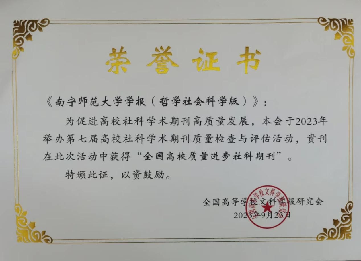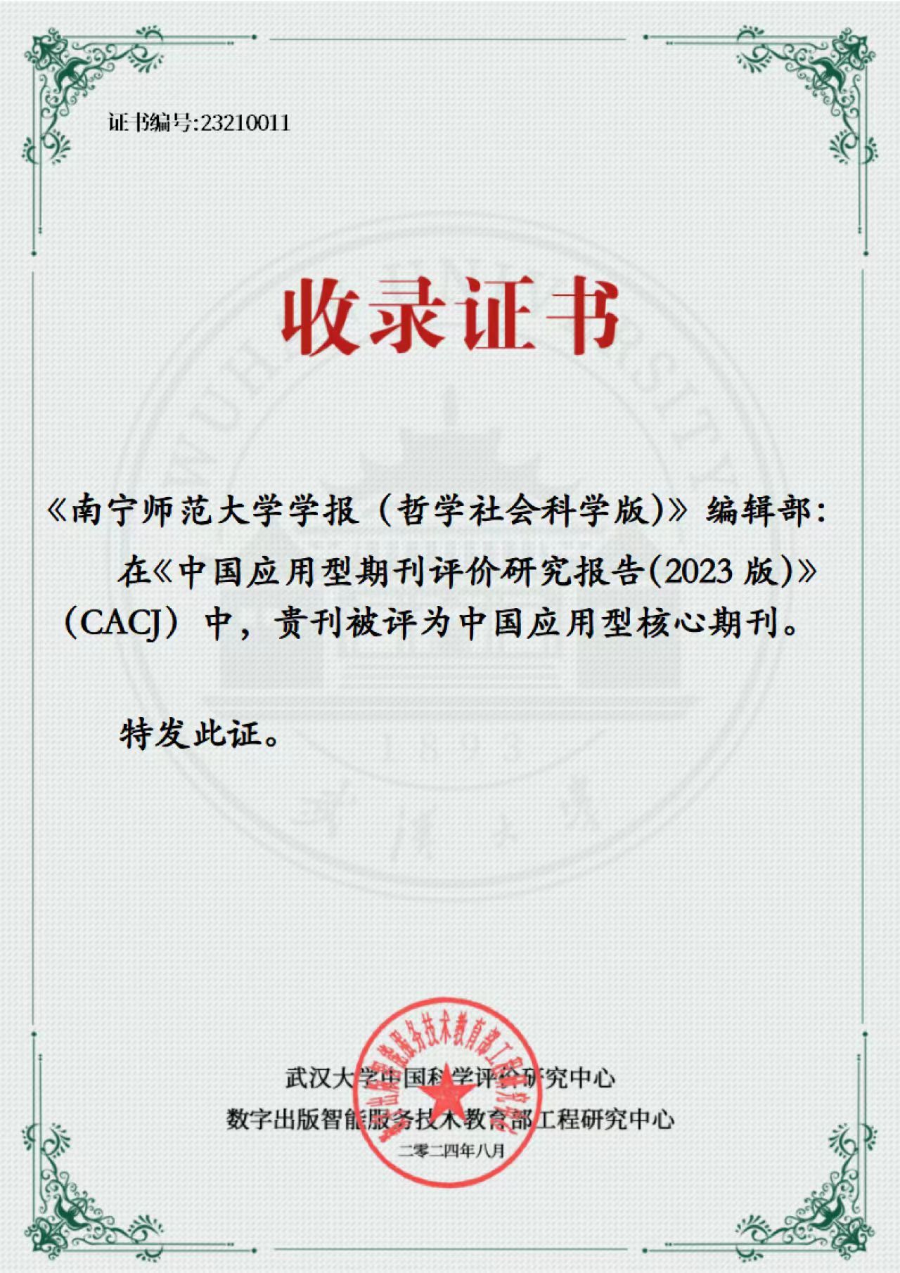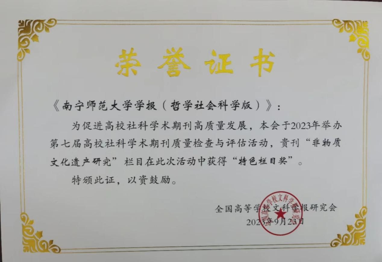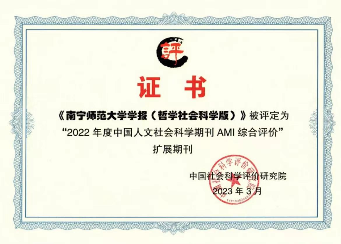 《南宁师范大学学报(哲学社会科学版)》创刊于1973年,是由南宁师范大学主管、主办的综合性人文社会科学学术期刊,双月刊,每逢单月1号出刊。入选中国人文社会科学期刊AMI综合评价扩展核心期刊、RCCSE中国核心学术期刊(A)、CACJ中国应用型核心期刊。曾获“首届中国百强学报”“第四届全国优秀社科学报”“第六届全国高校社科优秀期刊”“第七届全国高校质量进步社科期刊”“第十届广西优秀期刊”“2022~2023年度广西高校精品期刊”“2024~2025年度广西高校精品期刊”等荣誉。“非物质文化遗产”栏目于2010年、2023年两度被评为“全国高校社会科学期刊特色栏目”。