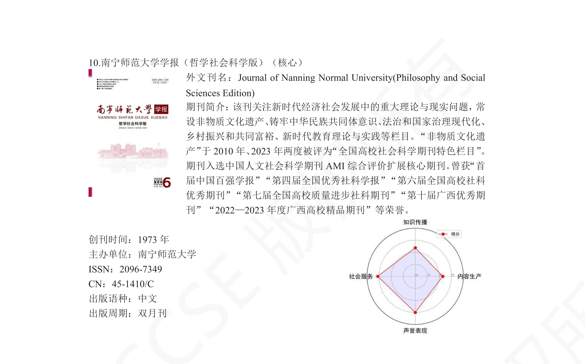 《南宁师范大学学报(哲学社会科学版)》继《中国应用型期刊评价研究报告》2023年版入选后,再次入选社会科学综合应用大类中国应用型核心期刊。该大类共入选期刊50种,包括3种权威期刊、17种核心期刊、20种核心扩展期刊。
